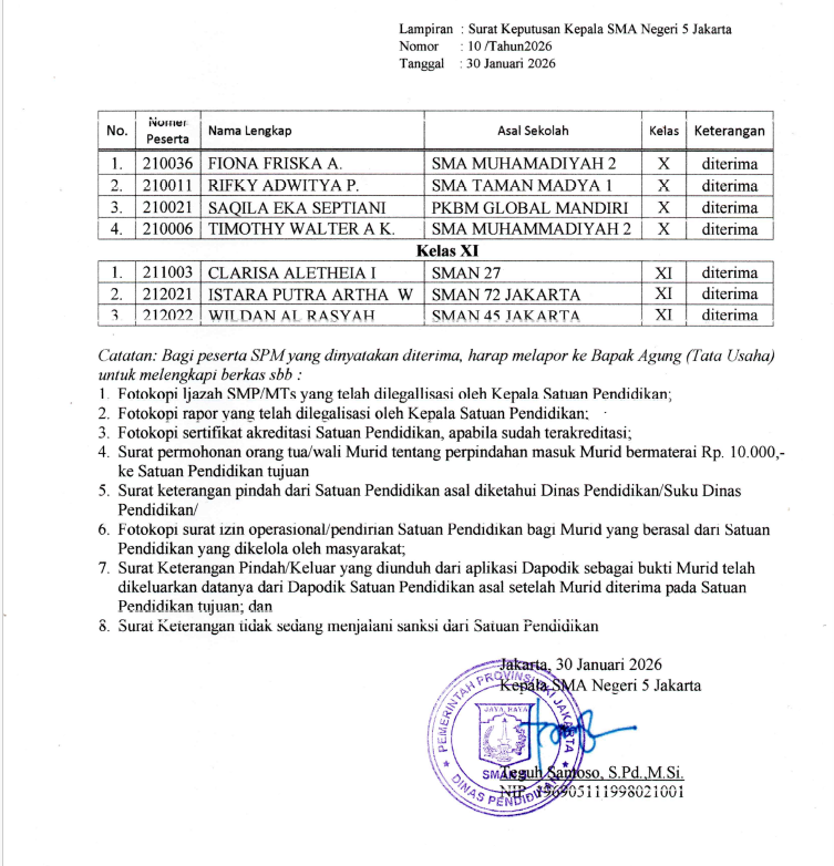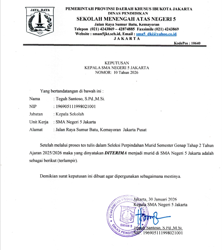 PENGUMUMAN HASIL TES SELEKSI SISWA MUTASI TAHAP 2 SMAN 5 Jakarta Januari 2026.
